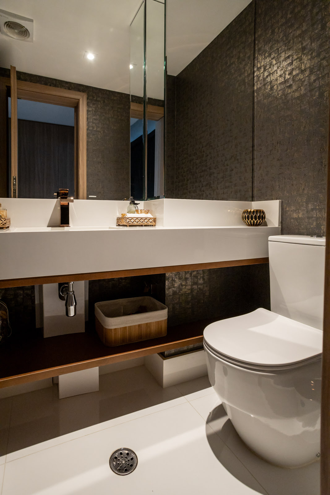 Do escritório Infinity Spaces Arquitetura e Interiores, a designer de interiores, Giseli Koraicho, foi responsável pelo projeto de imóvel que permitem ao casal e suas filhas desfrutarem os espaços sem interferir nas atividades um dos outros | | Logo na entrada do imóvel realizado pela designer Giseli Koraicho, avista-se a integração dos ambientes composta pelo living, cozinha com bancada para refeições rápidas e a área gourmet com churrasqueira | Fotos JP Image | Nos projetos residenciais, a missão do profissional designado para realizar o décor de interiores é suprir as necessidades de cada morador, seja ele adulto ou criança. Assim, é fundamental desenvolver soluções específicas que abracem tanto as necessidades individuais, assim como da família. Esse era o desejo compartilhado pelo casal, com duas meninas pequenas, quando confiaram à designer de interiores Giseli Koraicho, do escritório Infinity Spaces, para o projeto do seu apartamento de 180m², localizado no bairro Panamby, São Paulo. De acordo com ela, o planejamento do projeto junto aos clientes foi bastante tranquilo, uma vez que se tratava do segundo imóvel reformado por ela. “A ideia principal era aproveitar o pé direito duplo e criar um mezanino para as crianças aproveitarem. Na parte debaixo, dedicamos uma área social destinada para os adultos desfrutarem entre eles, bem como nas oportunidades em que recebem amigos e familiares”, detalha Giseli. Ela ainda acrescenta que, na história desse projeto, define-se satisfeita por superar o desafio de realizar ambientes com atmosferas totalmente diferentes. Hall de entrada | | Uma grande ‘caixa’ de madeira em em ‘U’ recepciona moradores e visitantes. Para deixar a entrada mais virtuosa, a designer de interiores Giseli Koraicho valorizou a cenografia do hall com fitas de LED | Fotos JP Image | Em seus projetos, Giseli tem apreço por idealizar halls de entrada sofisticados, deixando as pessoas impressionadas e, ao mesmo tempo, super à vontade desde o primeiro contato com o imóvel. Neste projeto não foi diferente: a profissional inovou optou por um modelo suspenso e minimalista de aparador que se evidencia com ares de elegância e sutileza. Sua fixação foi realizada no pórtico de madeira louro freijó que fecha o ambiente como uma ‘caixa’ e se destaca com a iluminação intimista dos perfis de LED. “A ideia era não só proporcionar luz aconchegante, mas conceber um desenho criativo ao espaço”, explica. Área social O hall de entrada abre o acesso para a área social do apartamento, onde tudo foi pensado para dois adultos que amam receber. Sendo assim, os ambientes desse setor foram totalmente integrados, resultando em um maior espaço para vivenciar bons momentos. Sala de jantar | | A sala de jantar é um dos principais ambientes do apartamento: a mesa com oito posições de cadeiras foi posicionada na área gourmet. Amplo conforto e bem-estar em eventos mais formais ou nos churrascos promovidos pelo casal | Fotos JP Image | A sala de jantar foi muito bem aproveitada, pois oferece muito conforto pela sua extensão e pelos móveis escolhidos, configurando-se como um lugar incrível. Ao trabalhar com o conceito aberto e explorando o pé direito alto, mesa e cadeiras foram posicionadas na área gourmet que inclui churrasqueira, adega e prateleiras com rótulos que valorizam o pé-direito. “Unindo os dois ambientes, nossa proposta foi propiciar uma estrutura ainda mais agradável e sem a necessidade de deslocamentos para a cozinha”, relembra Giseli. A decoração é outro ponto que chama a atenção. A área gourmet é decorada com as garrafas da pequena adega, que por conta do seu colorido, adicionam um toque de sofisticação para o ambiente. Na mesa de jantar, as flores roubam a cena. “Sou o tipo de pessoa apegada a detalhes e nada passa despercebido por mim. Sou apaixonada por arranjo de flores na mesa de jantar e faço questão de tê-las nos meus projetos”, lembra a designer. Home Office | | Com o desejo dos marcadores em não integrar o home office com a área social, a designer de interiores Giseli Koraicho conseguiu um espaço atrás da sala de jantar, onde a porta mimetizada esconde o local destinado ao trabalho | Fotos JP Image | Como o casal decidiu separar o andar de cima somente para as filhas, o local de trabalho também ficou no piso inferior do apartamento. Planejar o escritório do casal foi um desafio para Giseli, pois a designer precisou pensar em uma forma em que o espaço não invadisse a área social, já que estão praticamente no mesmo ambiente. A solução foi conceber o escritório atrás da sala de jantar – um layout super discreto, com porta mimetizada de madeira, que dá a impressão de que o lugar ‘não existe’ para quem visita o apartamento. Cozinha | | Bem ampla, a cozinha revela toda a funcionalidade e beleza que a família merecia. Uma das boas ideias de Giseli Koraicho foi trazer uma bancada de refeição rápidas para facilitar o dia a dia dos moradores. | Fotos JP Image | Com a correria do dia a dia, é muito comum ter pouco tempo para jantar ou almoçar com calma e à mesa. Pensando nisso, Giseli considerou a proposta de montar uma mesa bancada na cozinha, pois com poucos passos já é possível iniciar a refeição logo após o preparo da comida. “Normalmente, nos projetos incluem duas banquetas posicionadas do lado de fora da cozinha. Mas considerando os quatro integrantes da família, nada mais correto que dispor de lugares para todos”, ressalta a designer de interiores. A cozinha do apartamento fica de frente para a sala de estar e a bancada se configura como a única divisão entre os dois cômodos. Com a marcenaria planejada e muito bem pensada, o ambiente oferece praticidade com a disposição torre quente, armários e prateleiras que tornam o local ainda mais funcional. Já na parte dos revestimentos e acabamentos, Giseli escolheu tons neutros, sendo o branco a cor pred